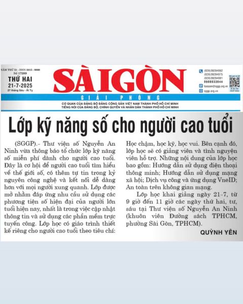 Các lớp học Kỹ năng số Miễn phí dành cho Người cao tuổi ở trạm Tech Thư viện số Nguyễn An Ninh, Tp.HCM được đăng tải thông tin chiêu sinh trên Báo Sài Gòn Giải Phóng - Cơ quan của Đảng bộ Đảng Cộng Sản Việt Nam tại Tp.Hồ Chí Minh, Tiếng nói của Đảng bộ, Chính Quyền và Nhân Dân Tp.Hồ Chí Minh.