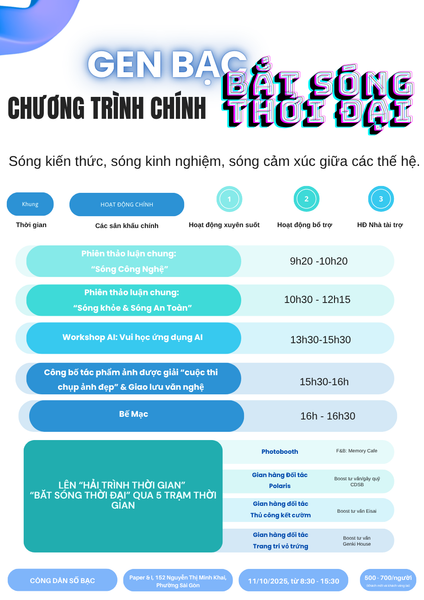 Với mong muốn xây dựng một cầu nối đa thế hệ vững chắc, Công Dân Số Bạc trân trọng giới thiệu sự kiện cộng đồng đặc biệt: Ngày hội "GEN BẠC – BẮT SÓNG THỜI ĐẠI". Đây là không gian dành riêng để người cao tuổi gặp gỡ, giao lưu và cùng thế hệ trẻ khám phá, học hỏi và lan tỏa những giá trị tốt đẹp.