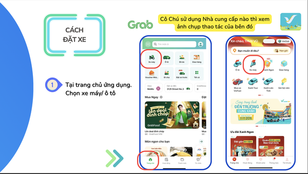 - Hướng dẫn quy trình đặt xe: Chọn loại xe (máy/ô tô), chọn điểm đón/điểm đến.